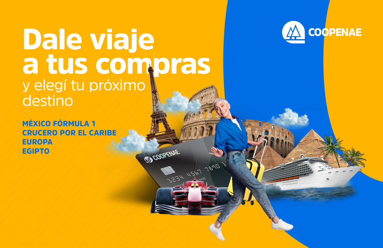 Hacé compras de ₡25.000 o su equivalente en dólares, con tu tarjeta de crédito o débito Coopenae VISA o Mastercard, estarás a un paso de ese viaje inolvidable, junto a un acompañante.